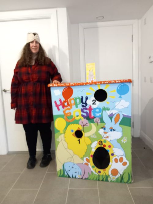 It started to drizzle, so the fun moved indoors, with games including ‘pin the tail on the rabbit’. The rabbit was beautifully hand-sewn by Inga onto a felt backdrop together with hand-sewn eggs. Members also played a ball game Geraldine designed, throwing balls into differently sized holes in a decorated box. Some young people were impressively accurate at this, even better than the adults!
